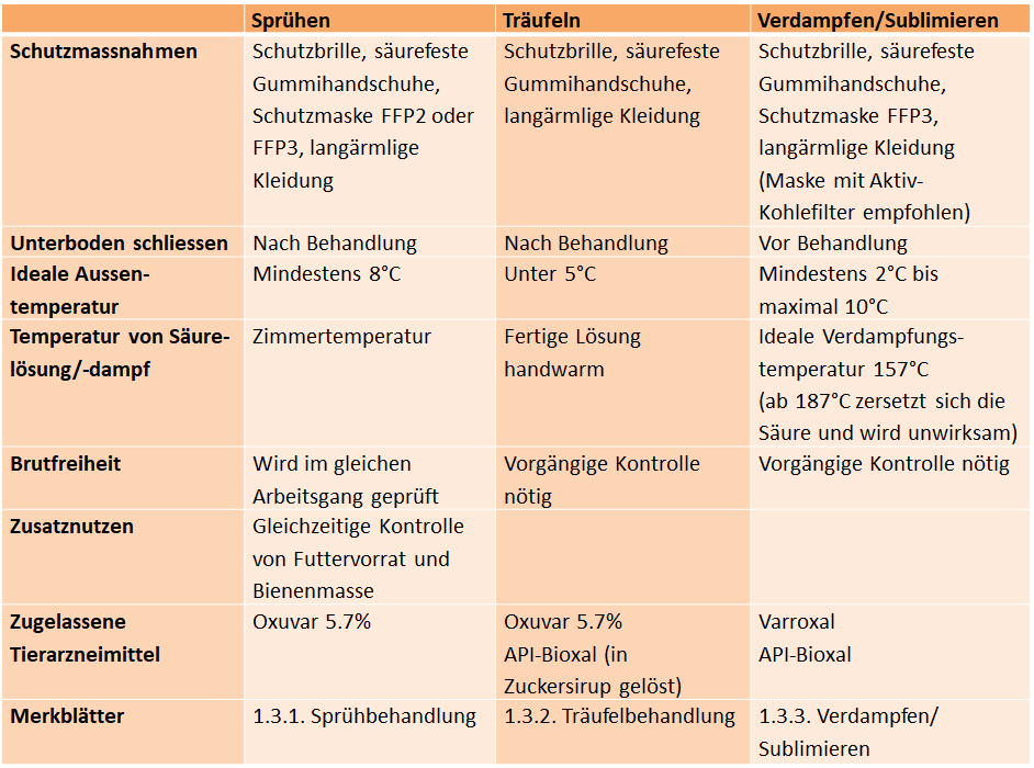 Für eine bestmögliche Wirkung sind vor der Winterbehandlung unbedingt alle Völker auf Brutfreiheit zu überprüfen. Die Behandlung war erfolgreich, wenn in den 14 Tagen nach der Behandlung maximal 500 Milben auf die gittergeschützte Unterlage fallen. Wird dieser Wert überschritten, ist eine zweite Behandlung erforderlich. Für diese kommen ausschliesslich die Methoden Sprayen oder Verdampfen in Frage.